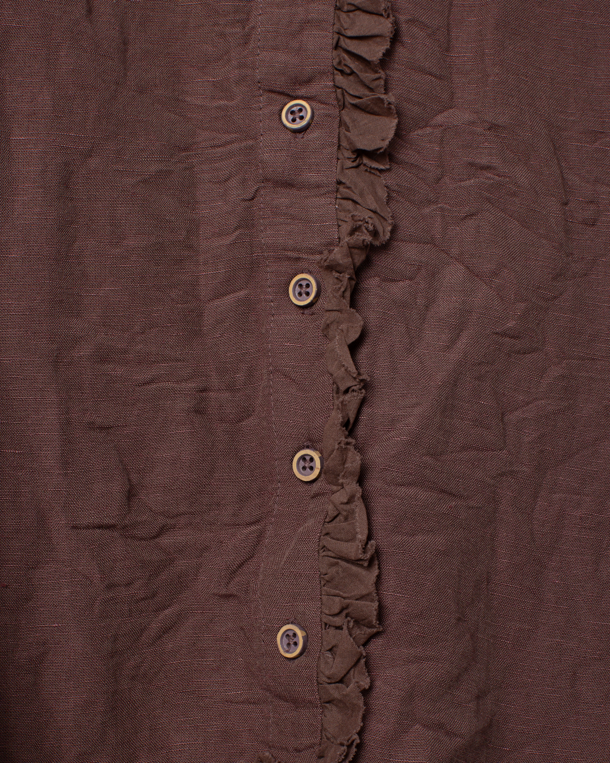 Irma eine wunderbare Bluse im Leinen und Viskose Gemisch. V-Ausschnitt und Rüschenkante, Knopfleiste vorne. Eine Bluse in gewohnter Optik und Design. Eins der Dinge die immer in jeden Schrank passen und zu Rock oder Buxe. Lange 'Ärmel und gerader Schnitt daher eher etwas sportlicher.