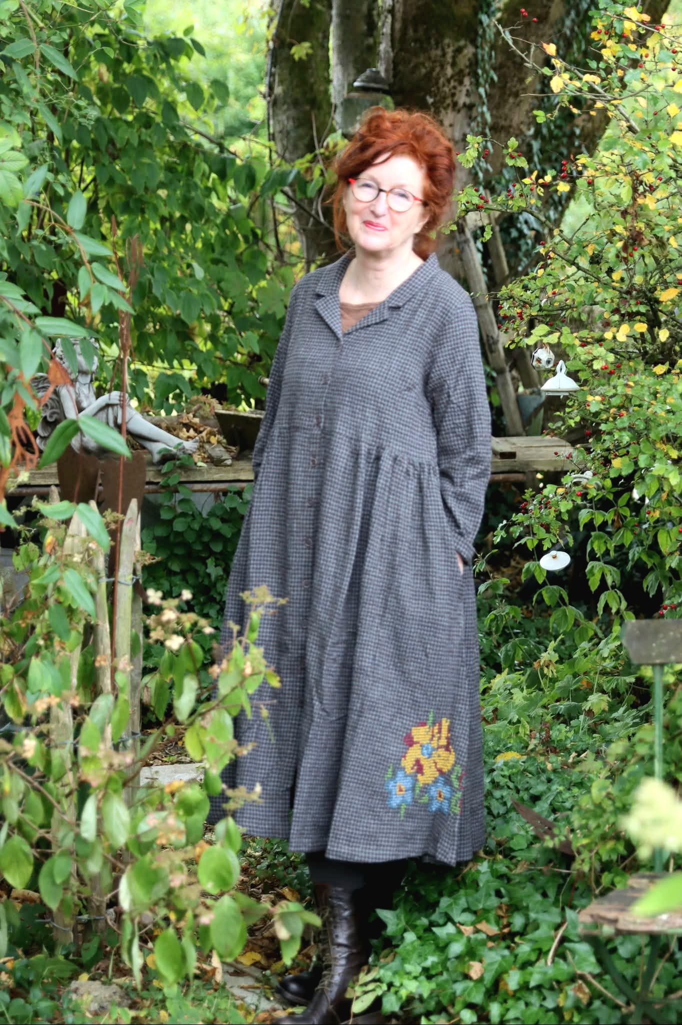 Helin ein wunderbares Mantelkleid mit absolut schöner Stickerei. V-Ausschnitt, Langarm, schöne Kragenlösung, Seitentaschen, durchknöpfbar und opulentes schwingendes Rückenteil. Wie immer macht Ewa i Walla nur Traumteile. Sie überraschten uns jedes Mal von neuem einfach perfekt