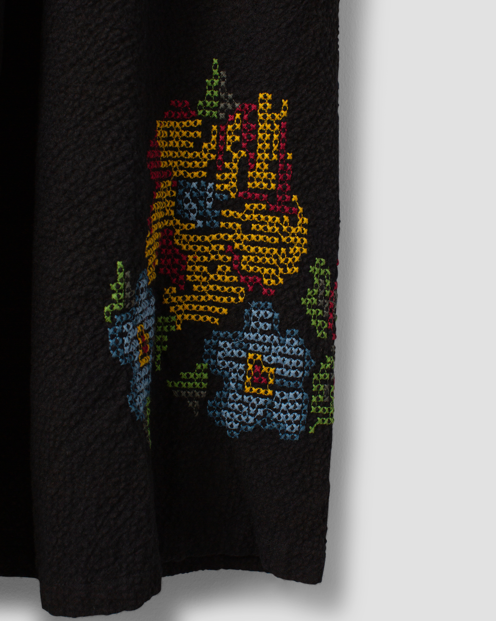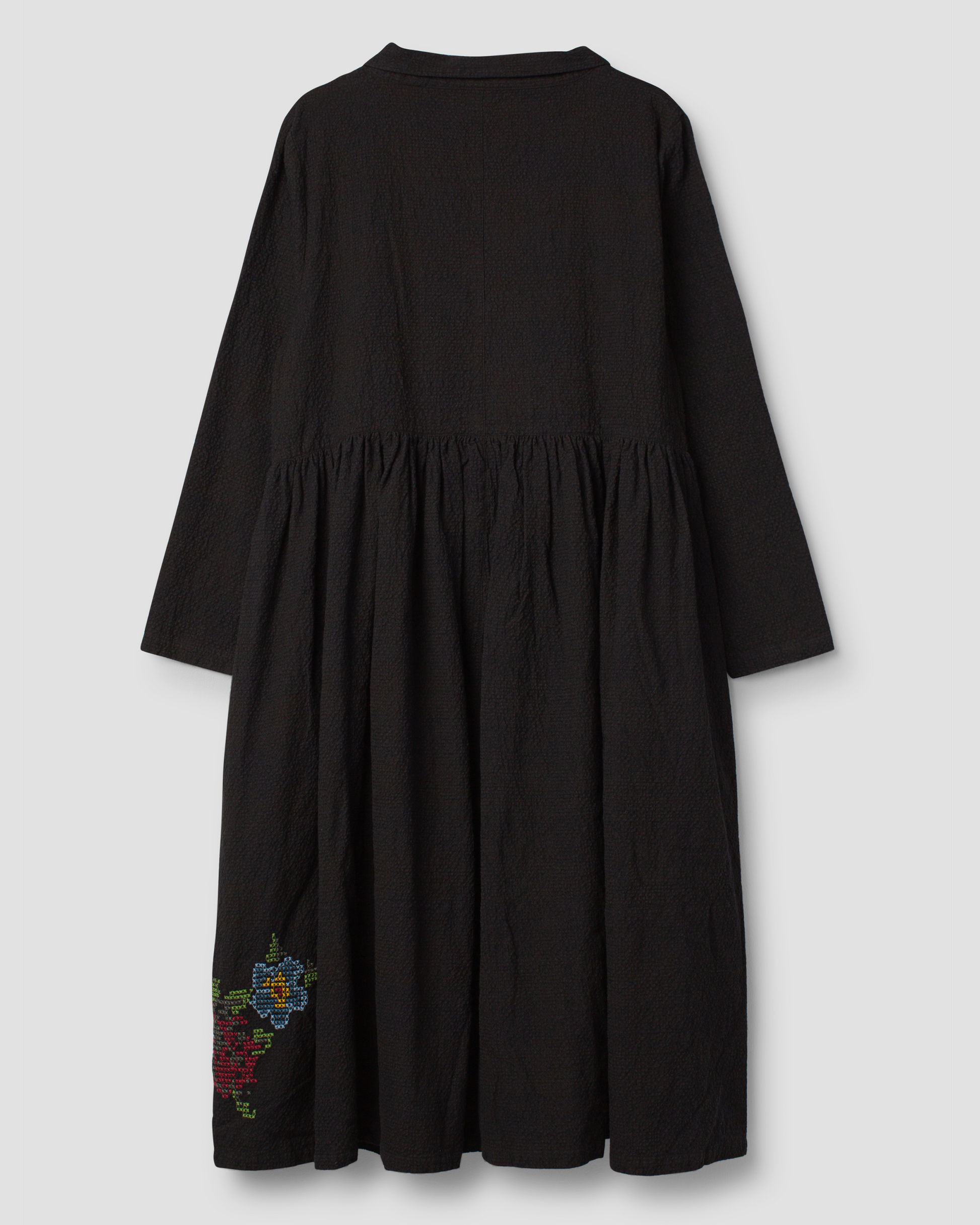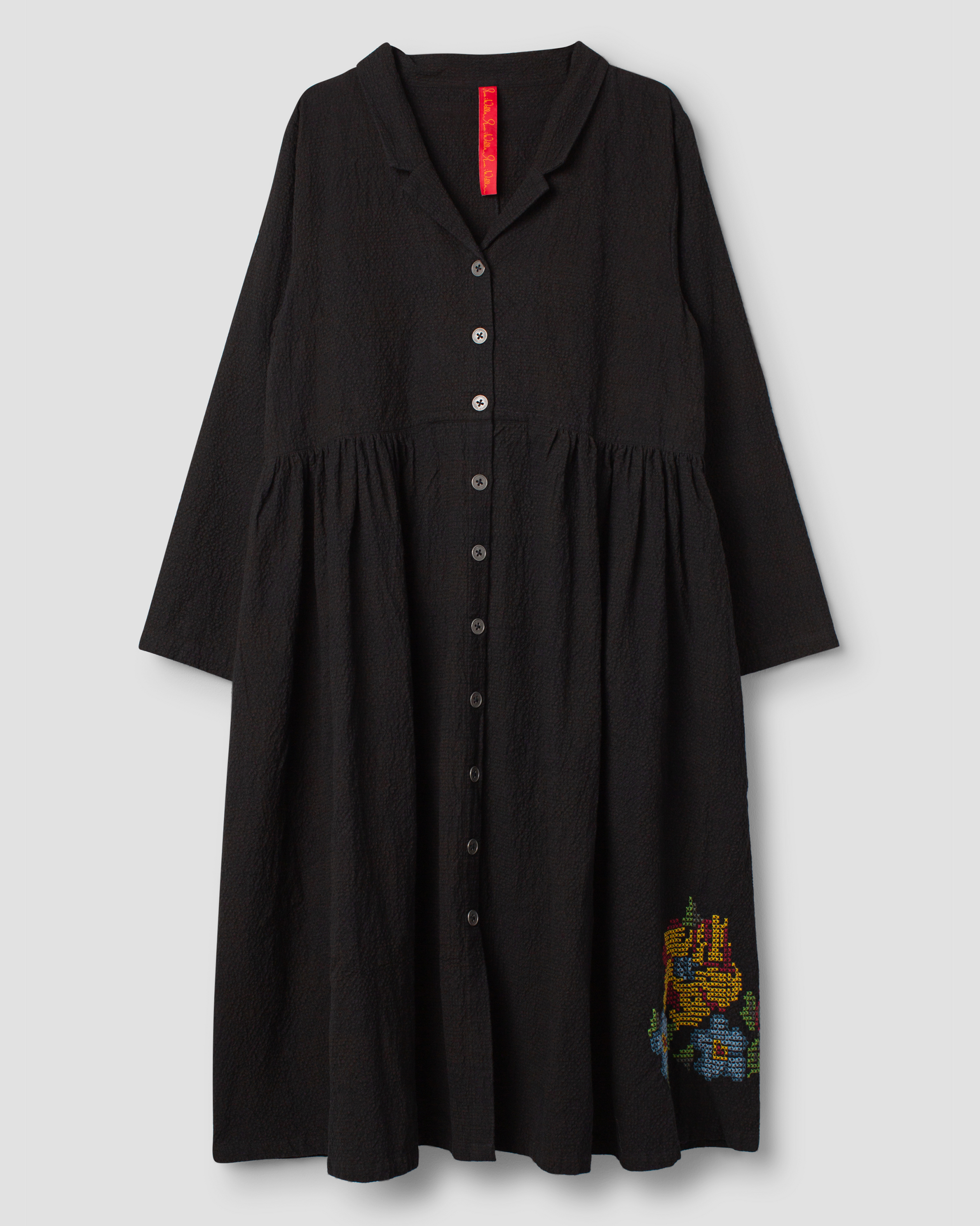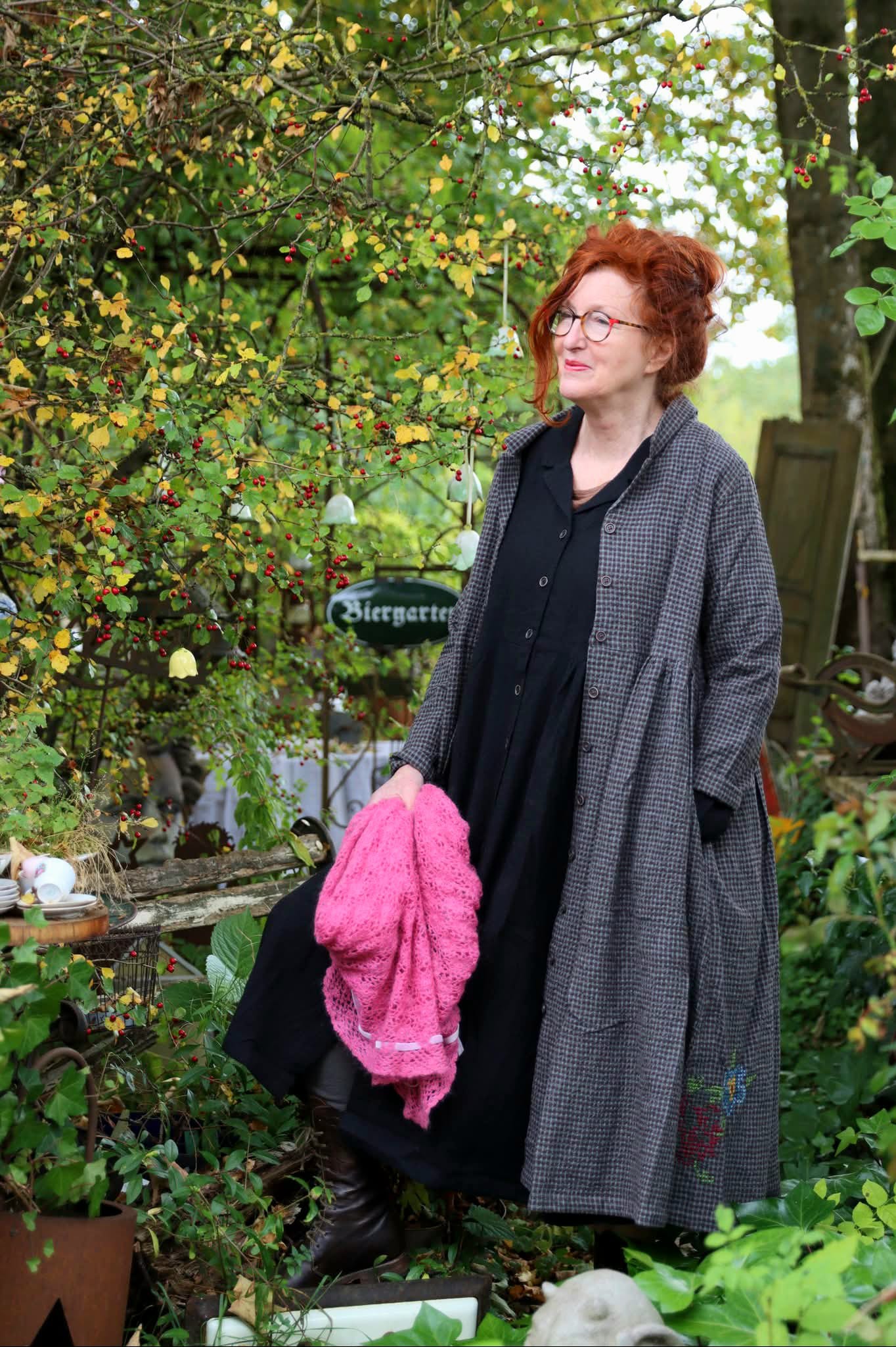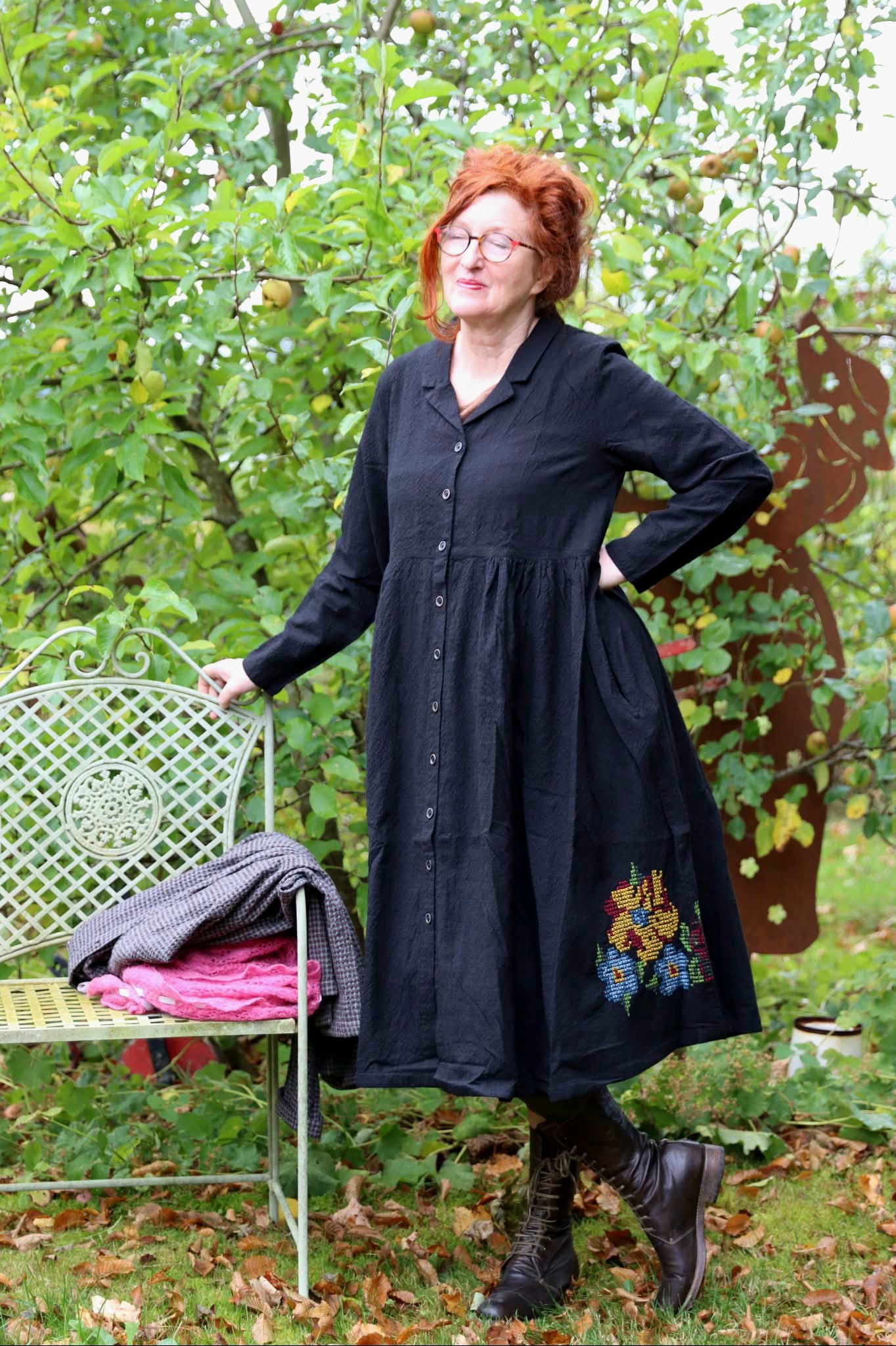 Helin ein wunderbares Mantelkleid mit absolut schöner Stickerei. V-Ausschnitt, Langarm, schöne Kragenlösung, Seitentaschen, durchknöpfbar und opulentes schwingendes Rückenteil. Wie immer macht Ewa i Walla nur Traumteile. Sie überraschten uns jedes Mal von neuem einfach perfekt
