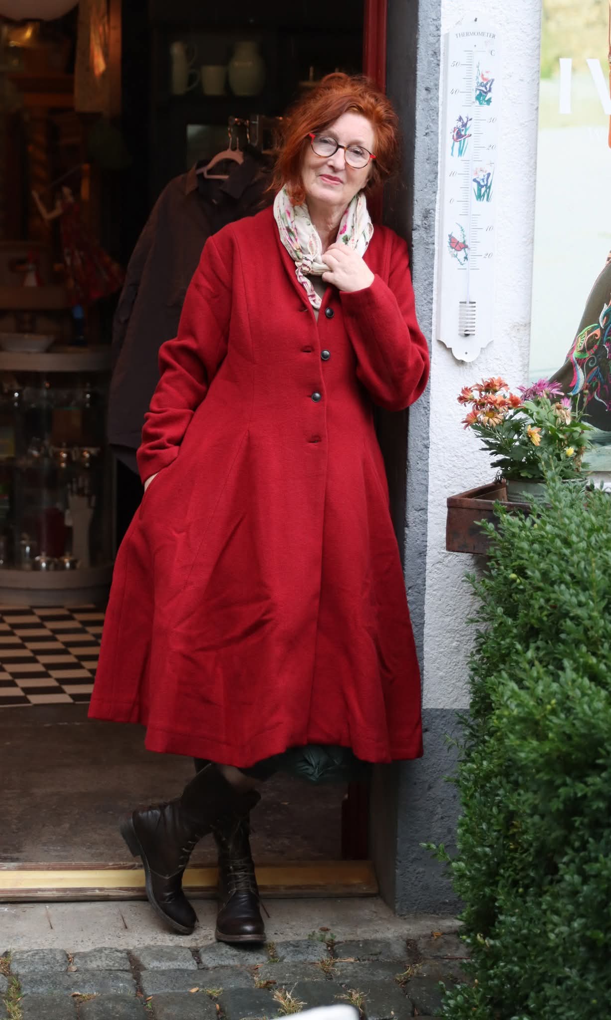 Ewa i Walla Mantel MAJROS in Rot  ein Mantel der Superlative wunderbarer Fall umschwingt die Hüfte und ist mit Taschen Knöpfen und Material einfach herrlich. So ganz nebenbei ein schöner Kragen der den Mantel auszeichnet und ihn als Schmuckstück zeigt. Unterstreicht nur unsere Figur . Majros gewohnter Schnitt super Wollmaterial besonders schöne Knöpfe wirklich ein toller Mantel